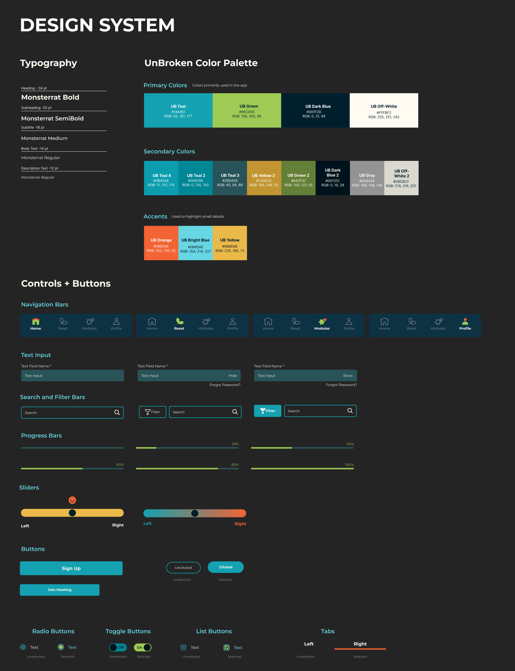 I created brand guidelines and a design system for Unbroken. I began by researching the Places to Thrive website and logo, and I drew colors from that palette. Since the client didn't have direct color codes or typeface names to provide, I selected typefaces that were very similar to those used on their website and presented a curated set of fonts to choose from.