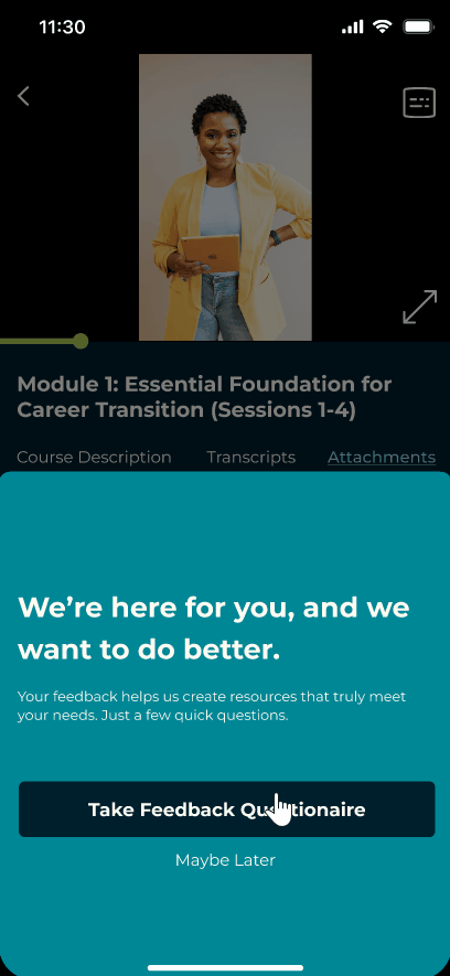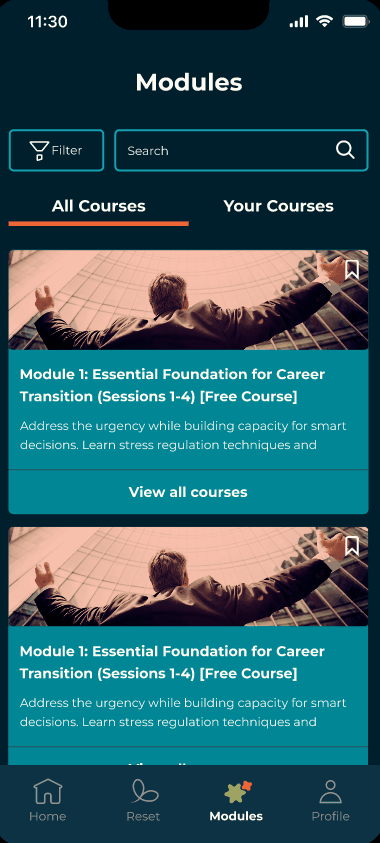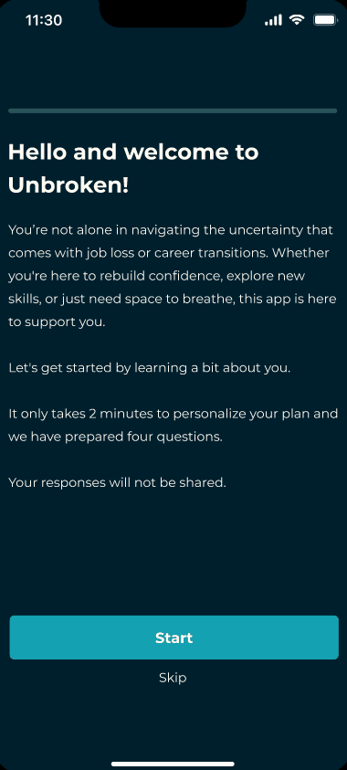 The Unbroken App was designed to meet users where they are, recognizing that everyone moves through displacement and career transitions at a different pace. The app provides flexible support tailored to the user's stage: